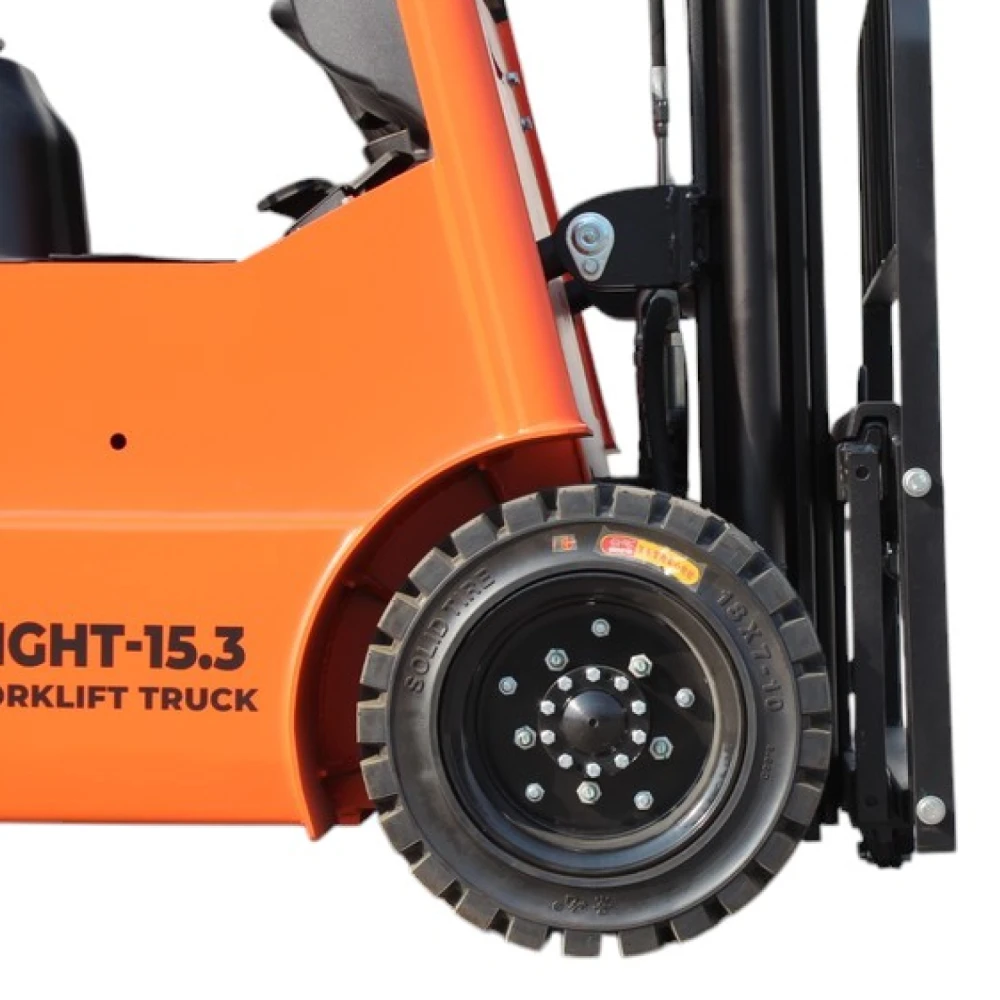 Прочные цельнолитые шины и четырёхколёсное исполнение обеспечивают устойчивость на разных поверхностях. Угол наклона мачты (5° вперёд и 10° назад) упрощает работу с грузами, а поперечная регулировка вил от 100 до 1040 мм делает технику универсальной для разных типов паллет.