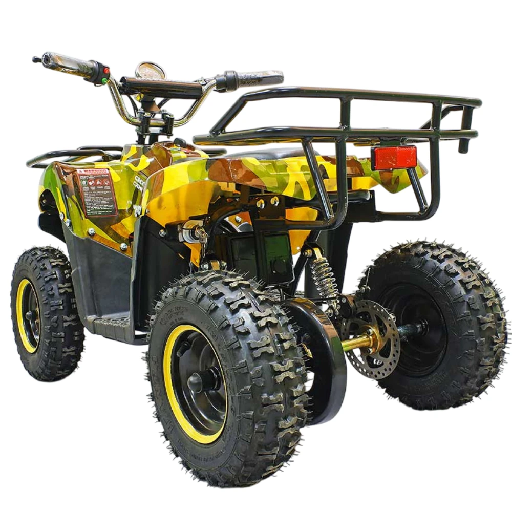 При мощности двигателя 800 Вт способен развивать скорость до 20 км/час. Объемные легко сцепляемые с поверхностью колеса по внешнему виду напоминают вездеходные. Квадроцикл рассчитан на детей от 3 до 7 лет, для езды по городской местности и парковой зоне. оснащен комфортными мягкими сиденьями, прост в управлении и обслуживании.
