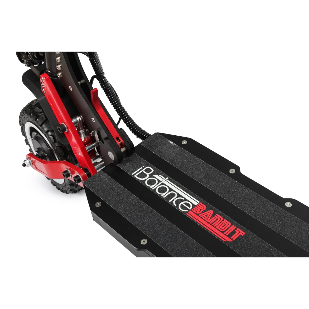 Электросамокат iBalance Bandit мощный полноприводный агрегат, который подойдет для передвижения по любому бездорожью. Прочная массивная конструкция вызывает доверие, максимальная нагрузка на устройство 150 кг. С усиленной амортизацией передних и задних колес электросамокат имеет плавный ход даже по гравийной дороге. Колеса диаметром 11 дюймов, с протекторными внедорожными шинами. В комплекте идут запасные шоссейные шины.