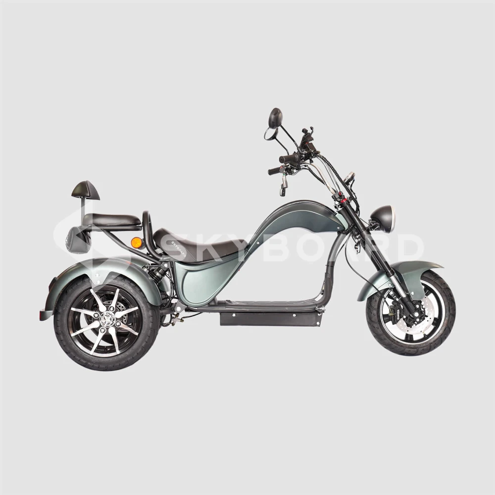 Электроскутер SKYBOARD TRIKE CHOPPER-4000 PRO FAST – мощный и эксклюзивный, первое, что приходит на ум при визуальном ознакомлении с техникой. Изогнутая рама, брутальный дизайн наталкивают на мысли о максимальных скоростях и непередаваемых ощущениях. Со слов производителя предчувствие клиентов является правильным.
