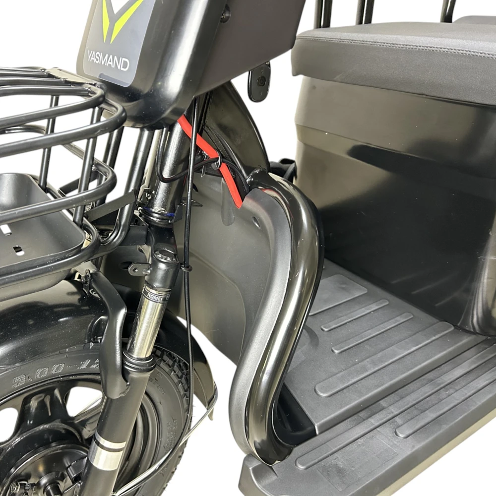 Yasmand R12 — трёхколёсный электротрицикл с задним приводом и мотором 1200 Вт. Он развивает скорость до 50 км/ч и обеспечивает комфортное передвижение по городу и на ровных загородных дорогах.