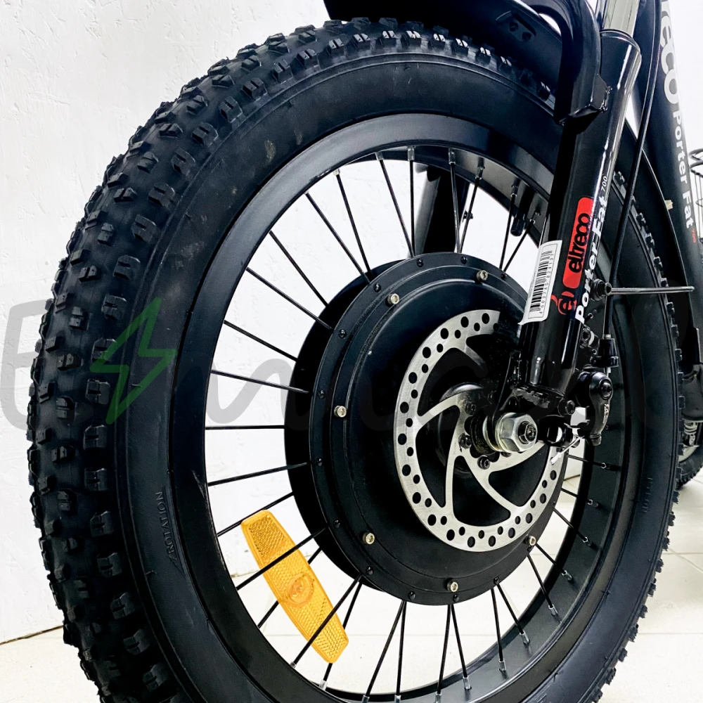 Велосипед имеет мощный электромотор c прямым приводом. Он легко преодолевает препятствия и неровности на пути благодаря передней амортизационной вилке. Имеет высокую проходимость и в снег, и в песок, и в грязь.