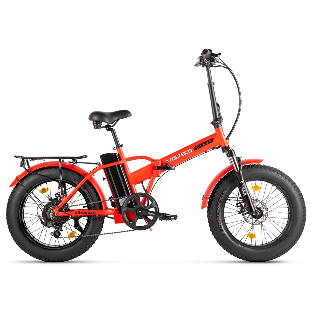Модель электрофэтбака VOLTECO CYBER красного цвета укомплектованная электромотором, который позволяет выполнять более комфортно работу самого устройства. Предназначен как для езды по снегу и льду, песку, грязи.  Катание на нем доступно каждому, очень легкий в управлении и эксплуатации, эргономичный. Колеса большого диаметра, но это только позволяет более легко преодолевать все препятствия. Демонстрирует маневренность, уверенность за рулем. Если вдруг произойдет такой случай, что разрядится аккумуляторная батарея, то можно выключить электро режим и доехать до места назначения как на обычном педальном велосипеде. Вы можете сами выбирать какой режим вам подходит именно для данной ситуации. Максимальная скорость 40 километров в час. Освоение управления не составит большого труда, так как большие навыки езды абсолютно не нужны. Конструкция и высококачественный материал из которого выполнено изделие позволяют исключить поломки, возможный дискомфорт от движения во время сложного участка дорожного покрытия.