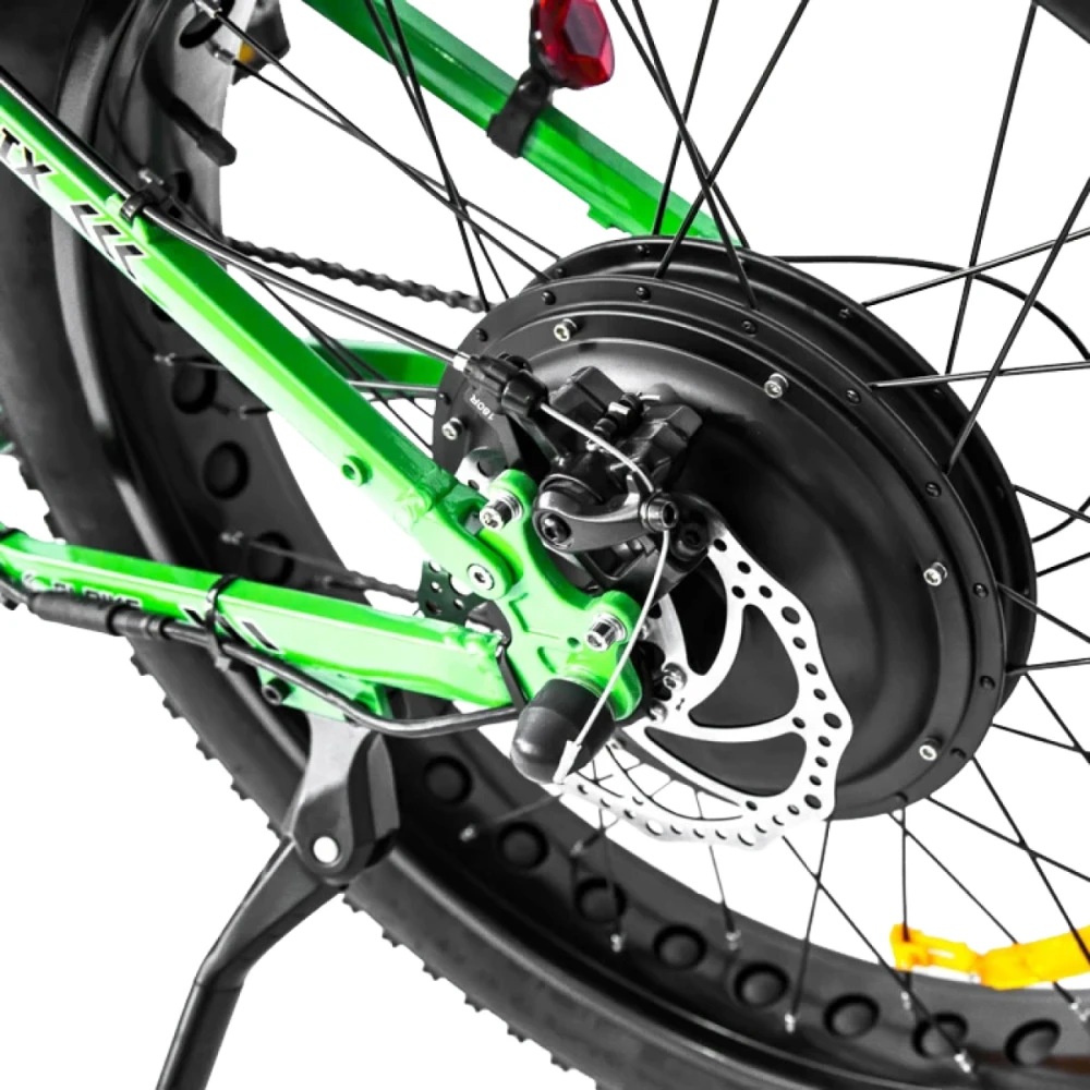 Техника оснащена мощным электромотором (1500 Вт) и емкой АКБ (48В 13А*ч), позволяющими развивать скорость до 45 км/час и преодолевать на одной подзарядке до 75 км пути. Последняя встроена в раму, надежно защищена от неблагоприятных факторов. Количество скоросей -7, удобная половинчатая ручка газа.