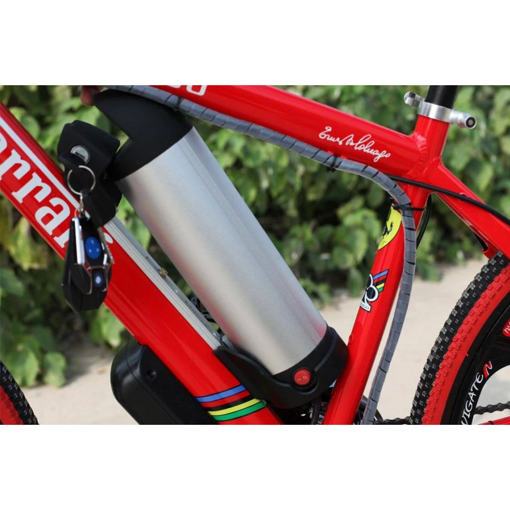 Электровелосипед Ferrari имеет задний привод, мотор мощностью 350 Вт расположен на заднем колесе, что дает преимущество при движении по бездорожью, при подъеме в гору. Максимальная скорость, которую развивает велосипед более 40 км/ч, есть режим переключения скорости, их 21. Дисковая тормозная система позволяет корректировать маневры.