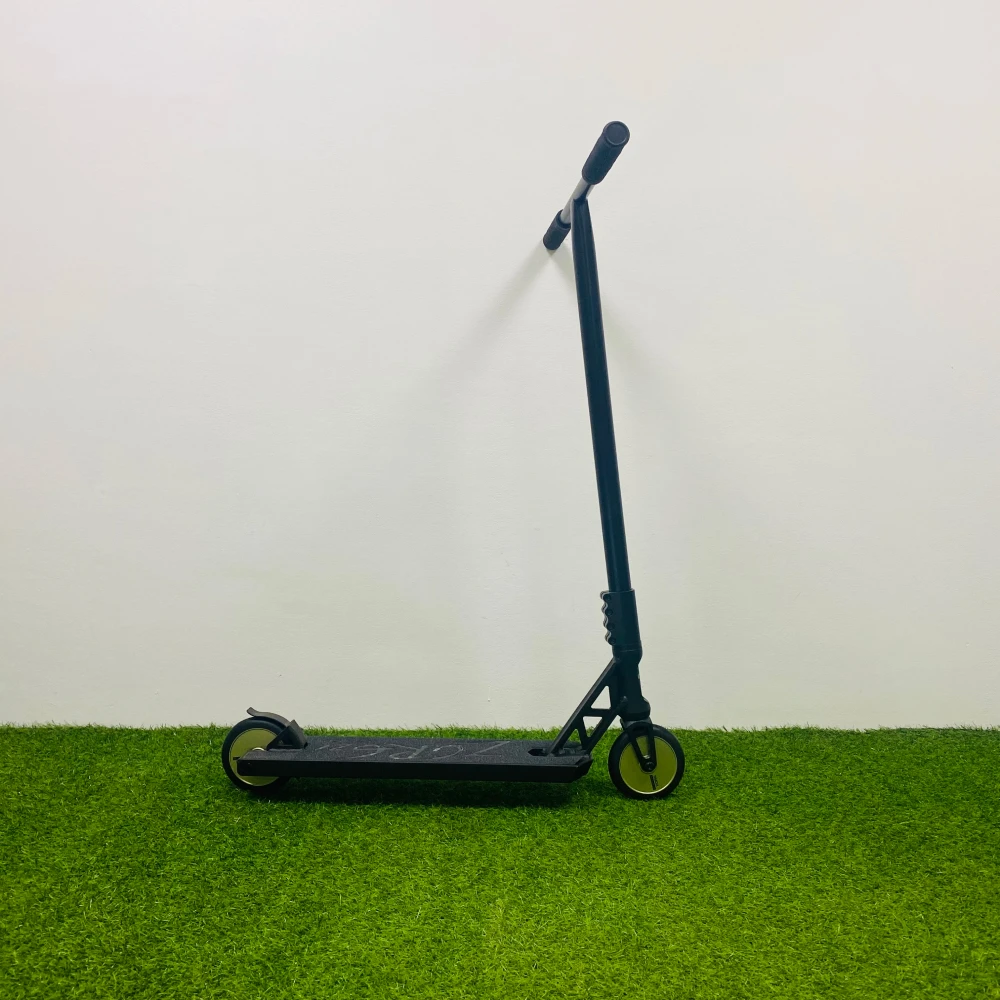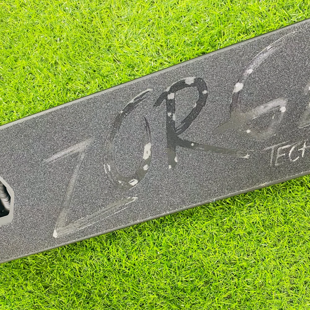 Широкая алюминиевая дека стала намного удобнее для езды за счет своего размера 14*56*41 см. Классическими остались и заваренные скошенная передняя ее сторона и квадратная задняя. Новинкой в этой модели является фендер, который защищает самокат от непреднамеренного торможения. Привычный стальной тормоз тоже не стали убирать. Алюминиевая фрезерованная вилка соединяется с высоким рулем системой SCS-компрессии с четырех болтовым зажимом на болтах-"шестерках”. Вращения колес обеспечивает подшипник ABEC 9 Chrome. А сами колеса выполнены из полиуретана с дисками из алюминия.