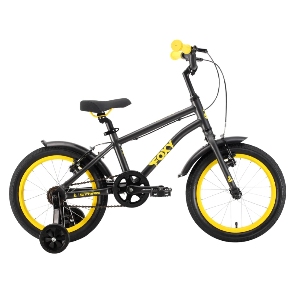 Велосипед Stark'22 Foxy Boy 16 черный/желтый также оснащен двумя детскими колесиками, которые обеспечивают стабильность и помогают мальчикам освоить навыки велосипедной езды.